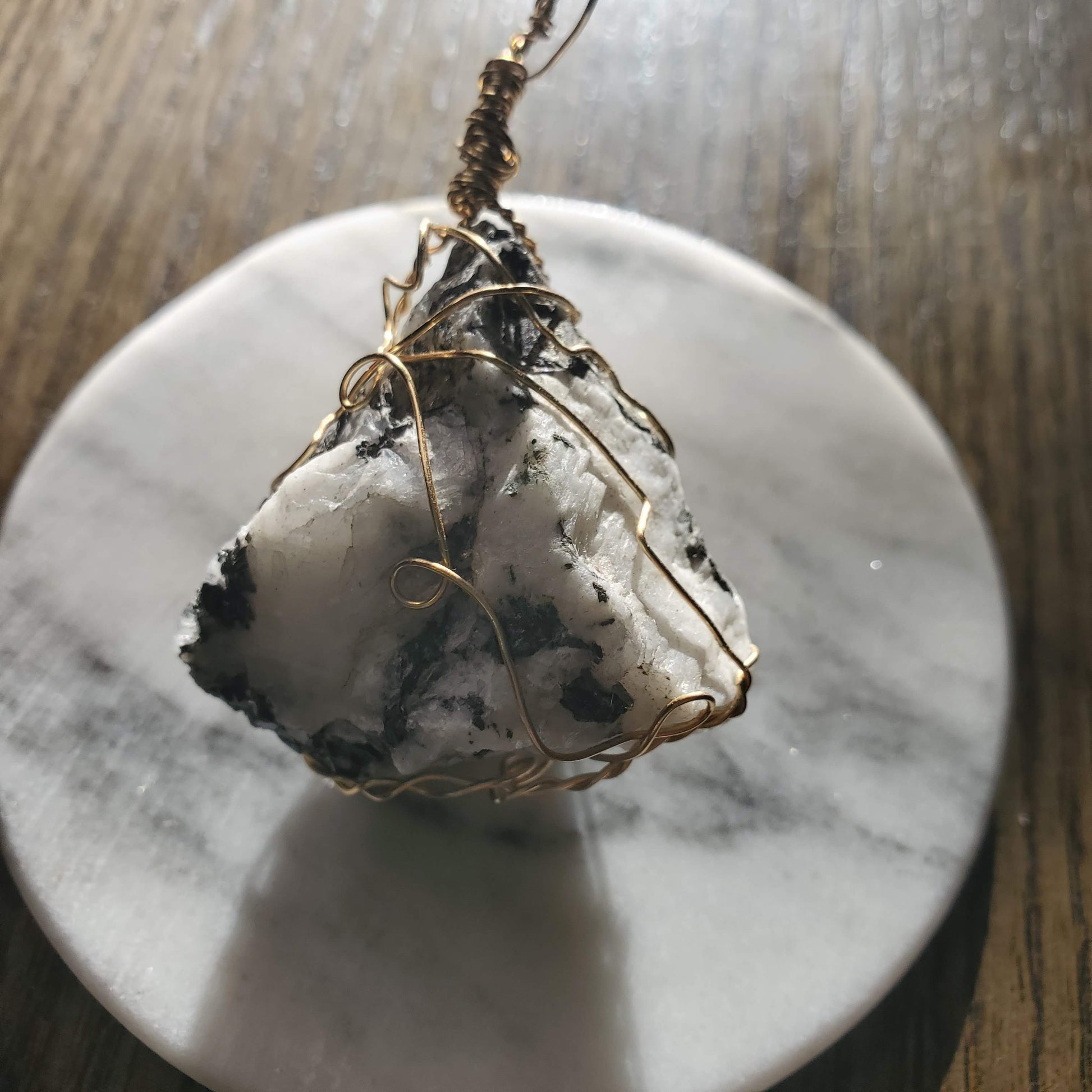 2. Wire-Wrapped Craftsmanship: The raw Moonstone crystal pendant is securely encased in a wire-wrapped design, a labor of love by our skilled artisans. This wire-wrapping adds an artistic touch while ensuring the crystal is safely attached to the pendant, allowing its mystical and feminine properties to shine through.
