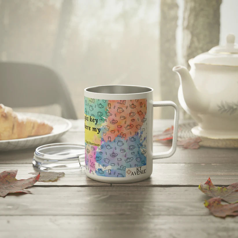 10oz Insulated Mug – with Toni Morrison’s quote: “Tea is the magic key to the vault where my brain is kept.”