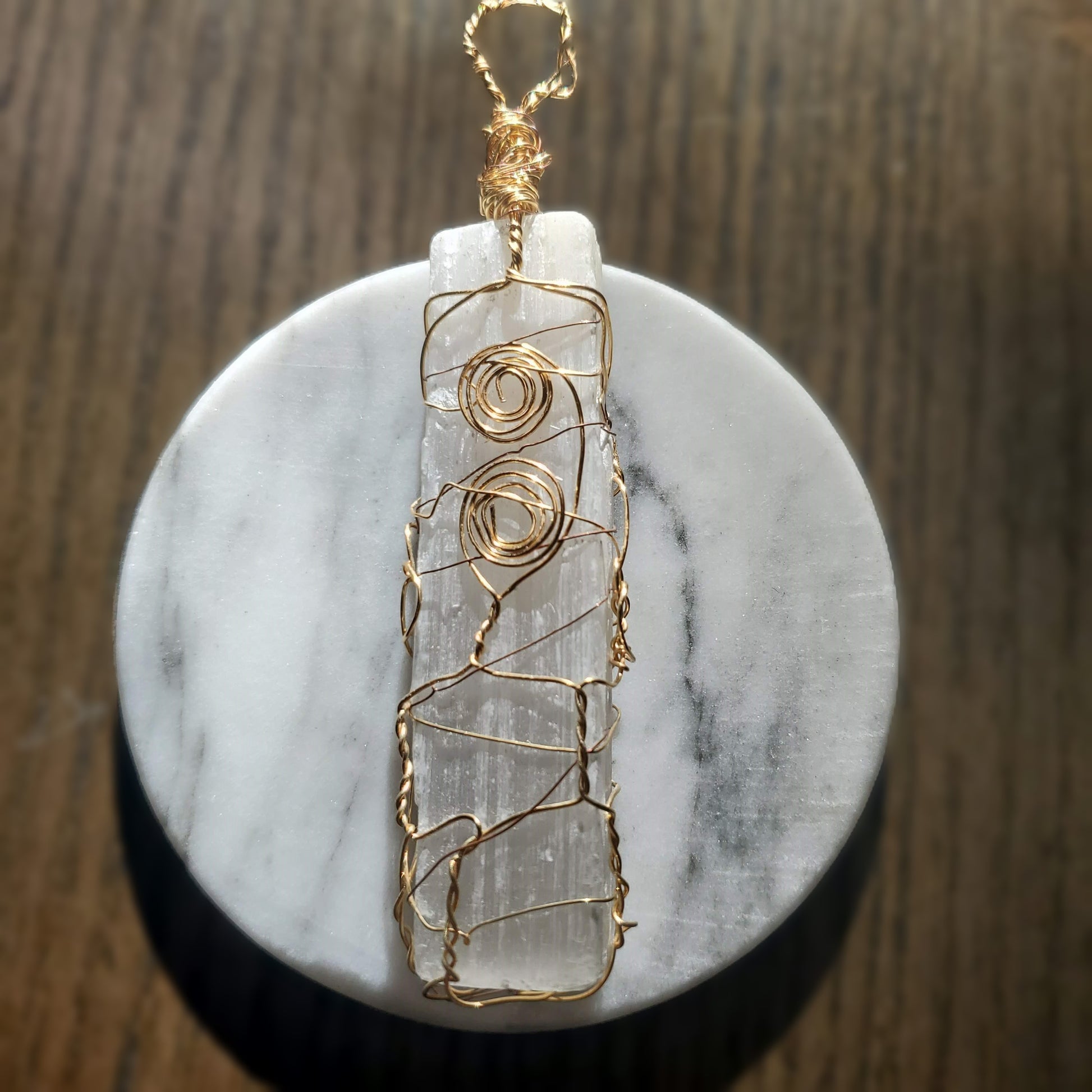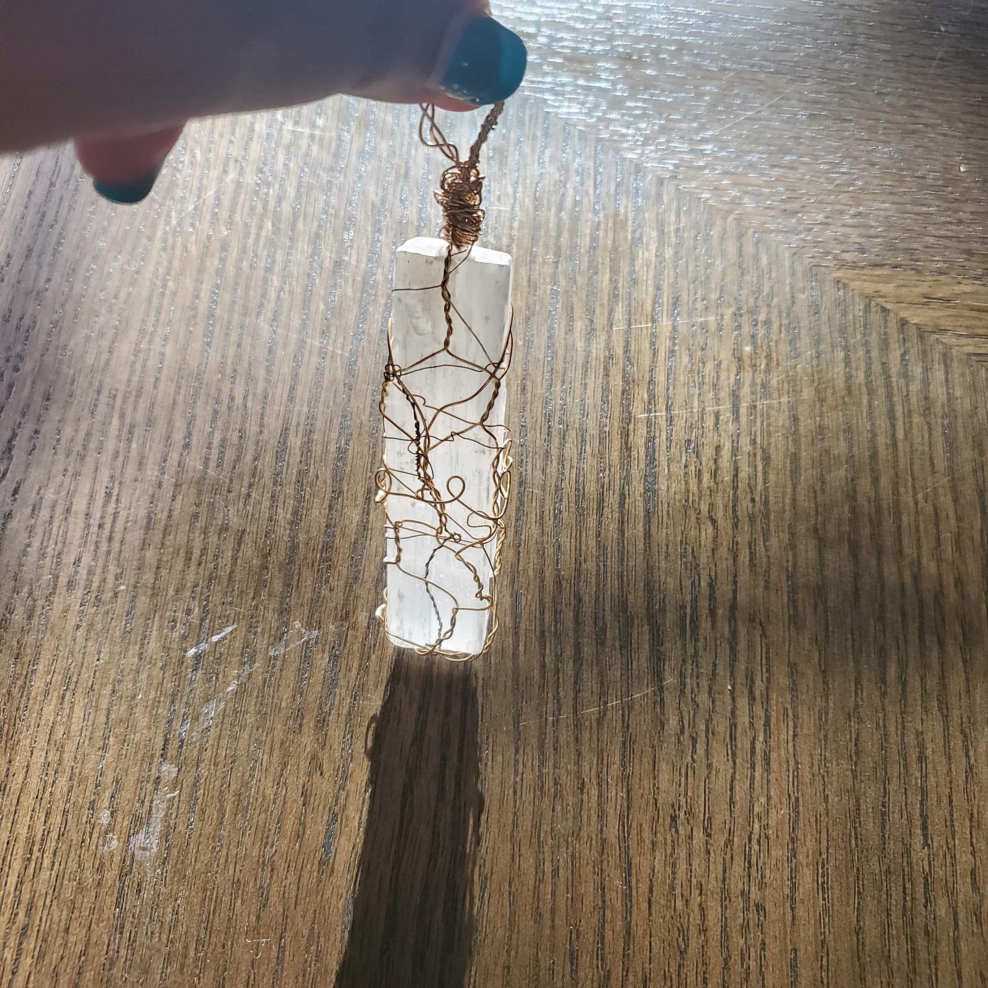 2. Wire-Wrapped Craftsmanship: The Selenite crystal pendant is securely encased in a wire-wrapped design created by our skilled artisans. This wire-wrapping adds an artistic touch while ensuring the crystal is safely attached to the pendant, allowing its soothing and protective properties to shine through.